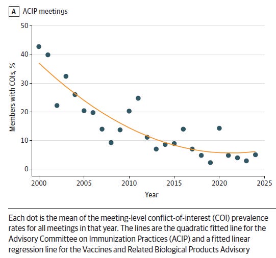 This is where some new data come in. A peer-reviewed study in JAMA analyzed every ACIP meeting from 2000 through 2024. In the early 2000s, about 43% disclosed a conflict. Since 2016, the average has been ~6%, and in 2024 it was just 5%. Of those, less than 1% were personal financial conflicts such as consulting fees or stock ownership - the rest were research grants!!